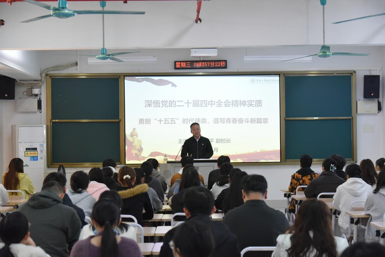在专题授课中,阙勇平副校长以《深悟党的二十届四中全会精神实质 勇担“十五五”时代使命,谱写青春奋斗新篇章》为题,从四个方面展开系统讲解:一是回顾“十四五”时期我国发展取得的重大成就;二是阐释“十五五”时期经济社会发展的重大意义;三是解读党的二十届四中全会擘画的未来蓝图;四是说明党的二十届四中全会精神对大学生成长成才的现实指引。授课过程中,他紧扣时代脉搏,将政策精神与社会现实相结合,用通俗易懂的语言帮助同学们准确把握全会精神的核心要义,引导大家把人生理想融入强国建设、民族复兴伟业的时代洪流,更加坚定勇担“十五五”时代使命的信念与责任。