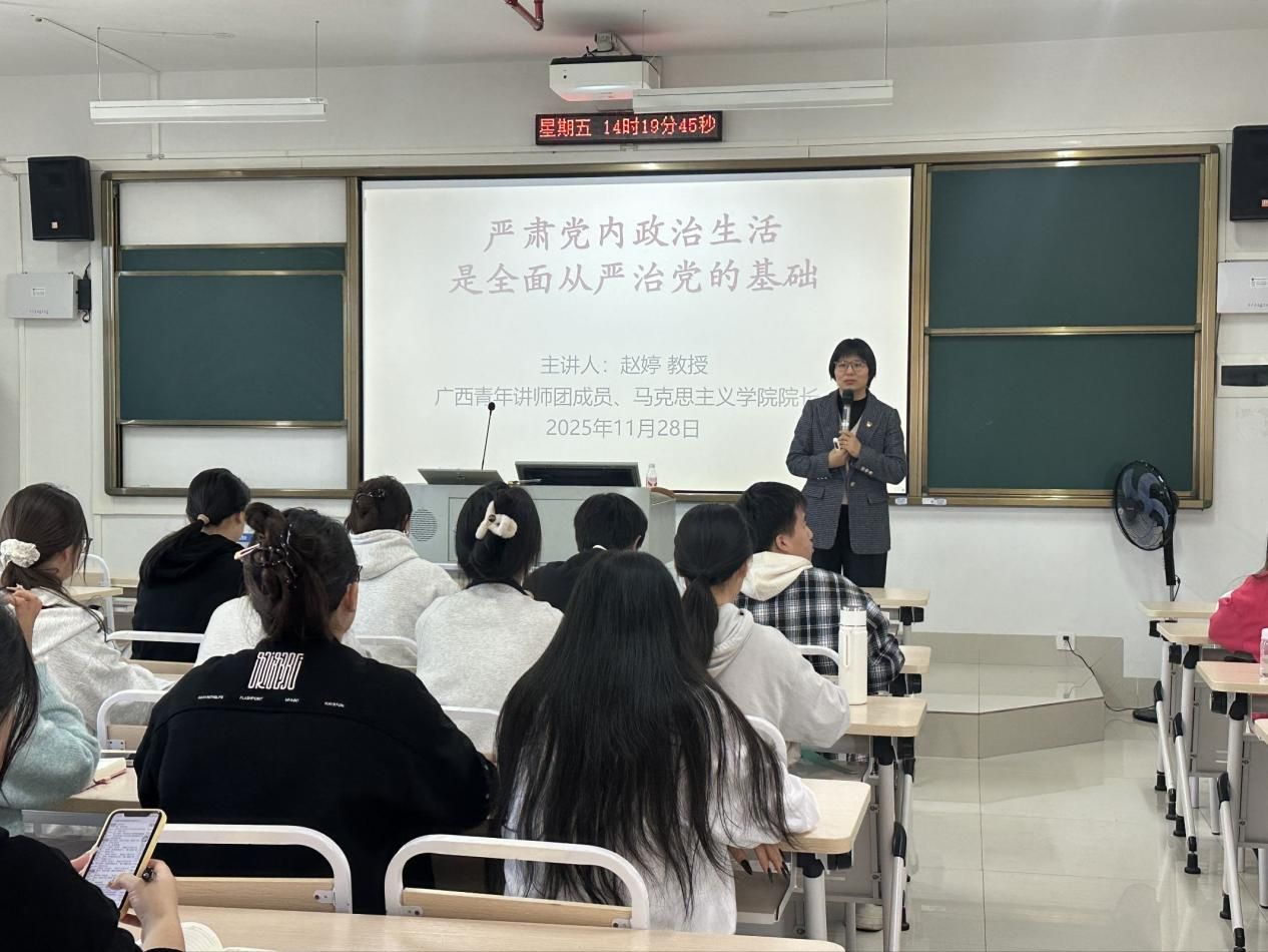 在党课上,教师们围绕党的二十届四中全会精神、习近平新时代中国特色社会主义思想、党员权利与义务、铸牢中华民族共同体意识等内容展开深入讲解,呈现了多堂高质量的专题党课。赵婷老师以《严肃党内政治生活是全面从严治党的基础》为题展开授课,林勇灵老师以《深入学习党的二十届四中全会精神》为题展开授课,孙世超老师以《向新质生产力要增长新动能——学习贯彻习近平经济思想》为题展开授课,钟兰老师围绕《读懂党章百年史,践行青春新征程》展开授课,罗北战老师以《百年党史及启示》为题展开授课,王开荣老师以《深学笃行改革新思想 勇毅担当奋进新征程》为题展开授课,韦慧妮老师围绕《持之以恒推进全面从严治党》展开授课,黄必忠老师以《准确理解、全面把握党员权利与义务的辩证统一关系》为题展开授课,陶艳兰老师围绕《铸牢中华民族共同体意识》展开授课,覃田老师以《明晰标准 规范程序——从思想到行动的入党指南》为题展开授课,李明老师以《习近平新时代中国特色社会主义思想是“两个结合”的重大成果》为题展开授课,陈凤俭老师以《奋进新征程、建功新时代——深入学习贯彻党的二十届三中全会精神》为题展开授课,廖谨媛老师以《促进各民族像石榴籽一样紧紧抱在一起》为题展开授课。