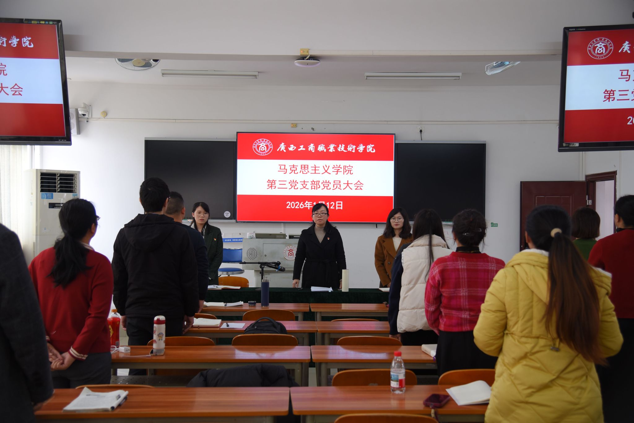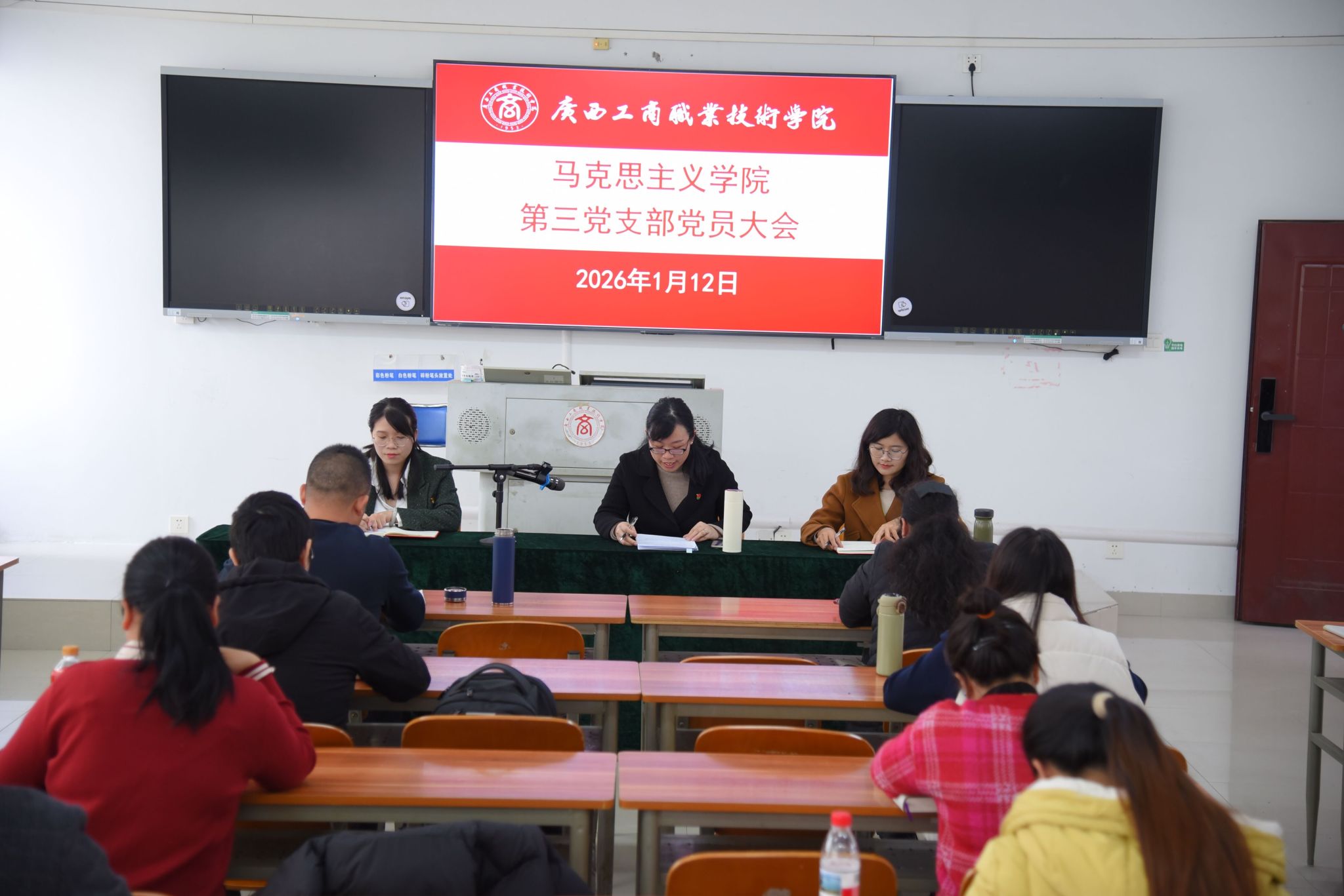 2025年1月12日,马克思主义学院第三党支部在鹏飞校区2307教室召开全体党员大会,开展党支部委员会换届选举工作。会议由第三党支部书记覃田同志主持,支部全体党员参加。